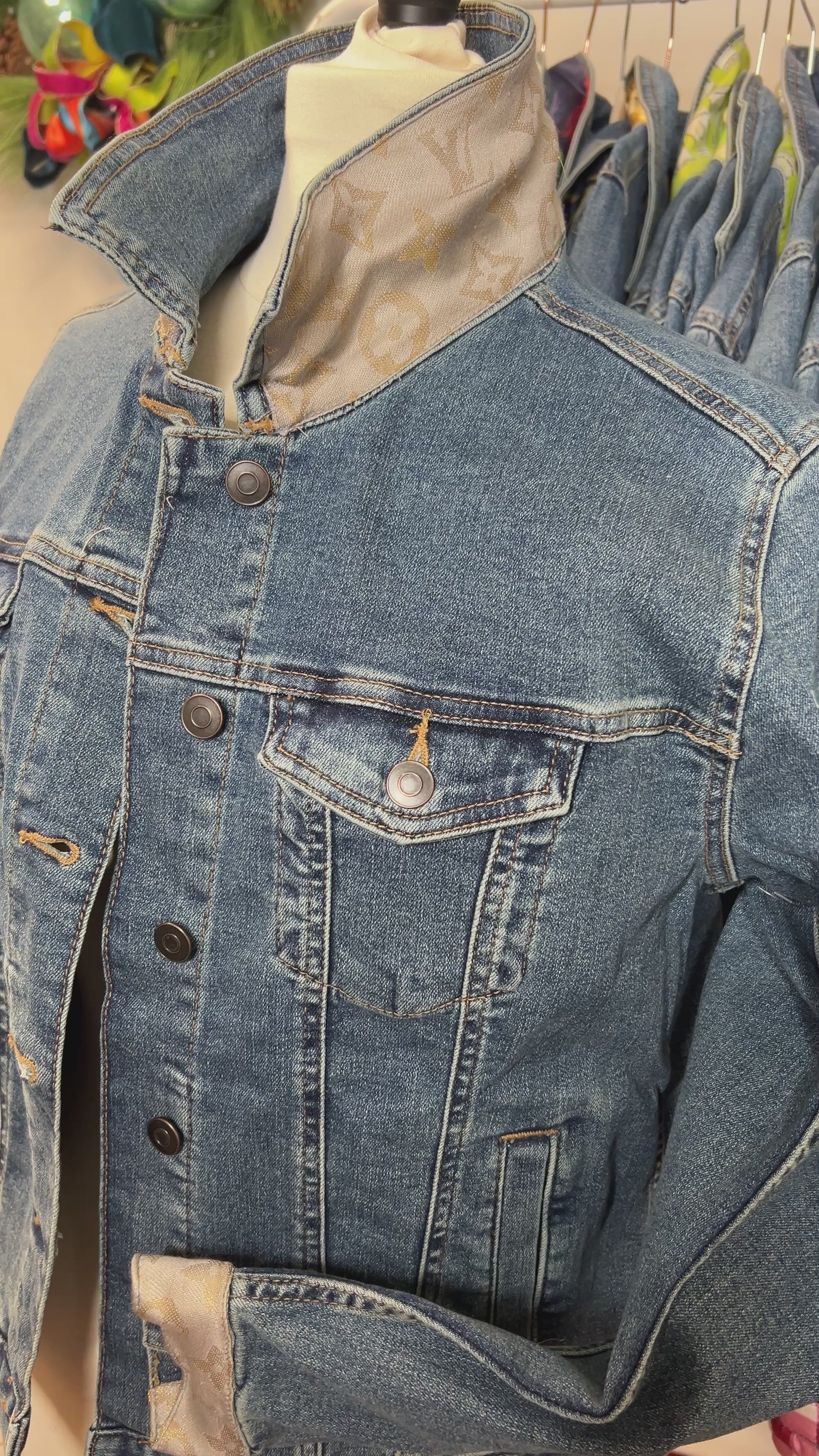 Elevate your wardrobe with this stunning designer scarf denim jacket, where premium craftsmanship meets timeless style. This exclusive piece features a gorgeous neutral silk LV scarf embellishment with shimmering metallic gold thread accents that catch the light beautifully.
