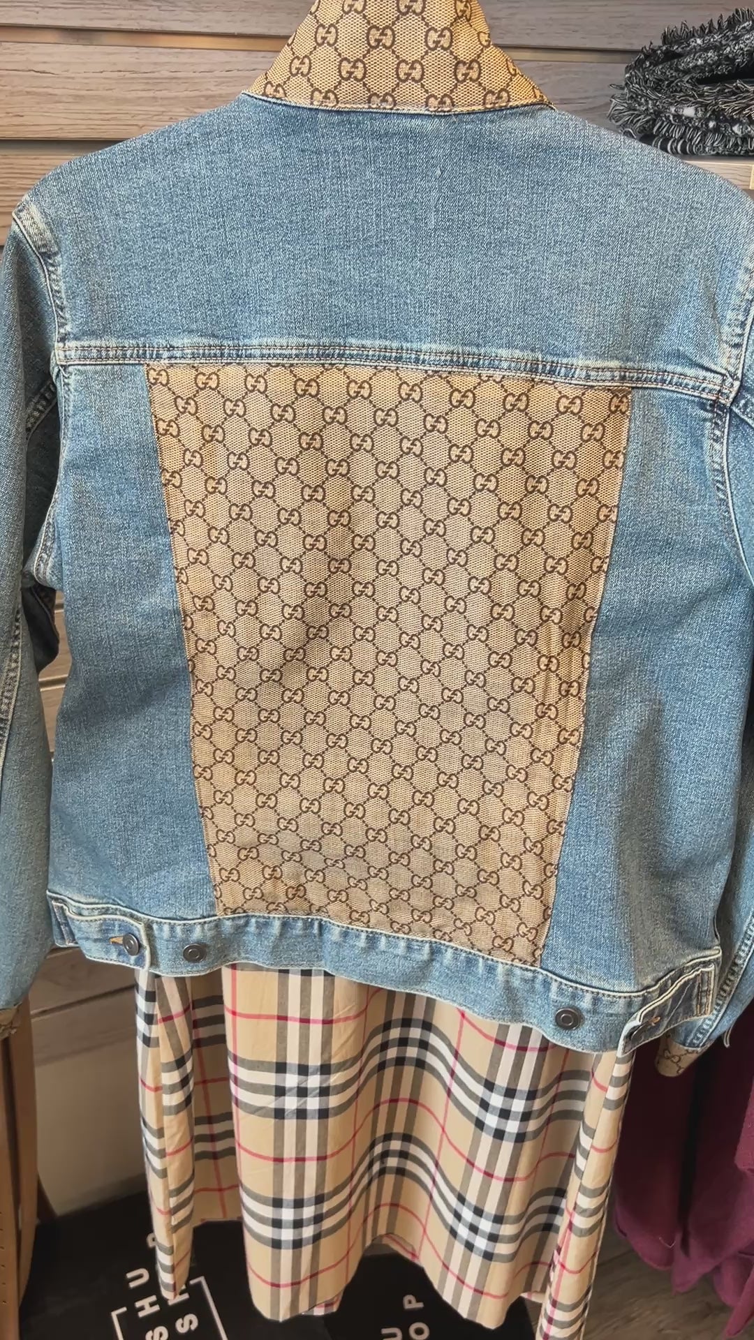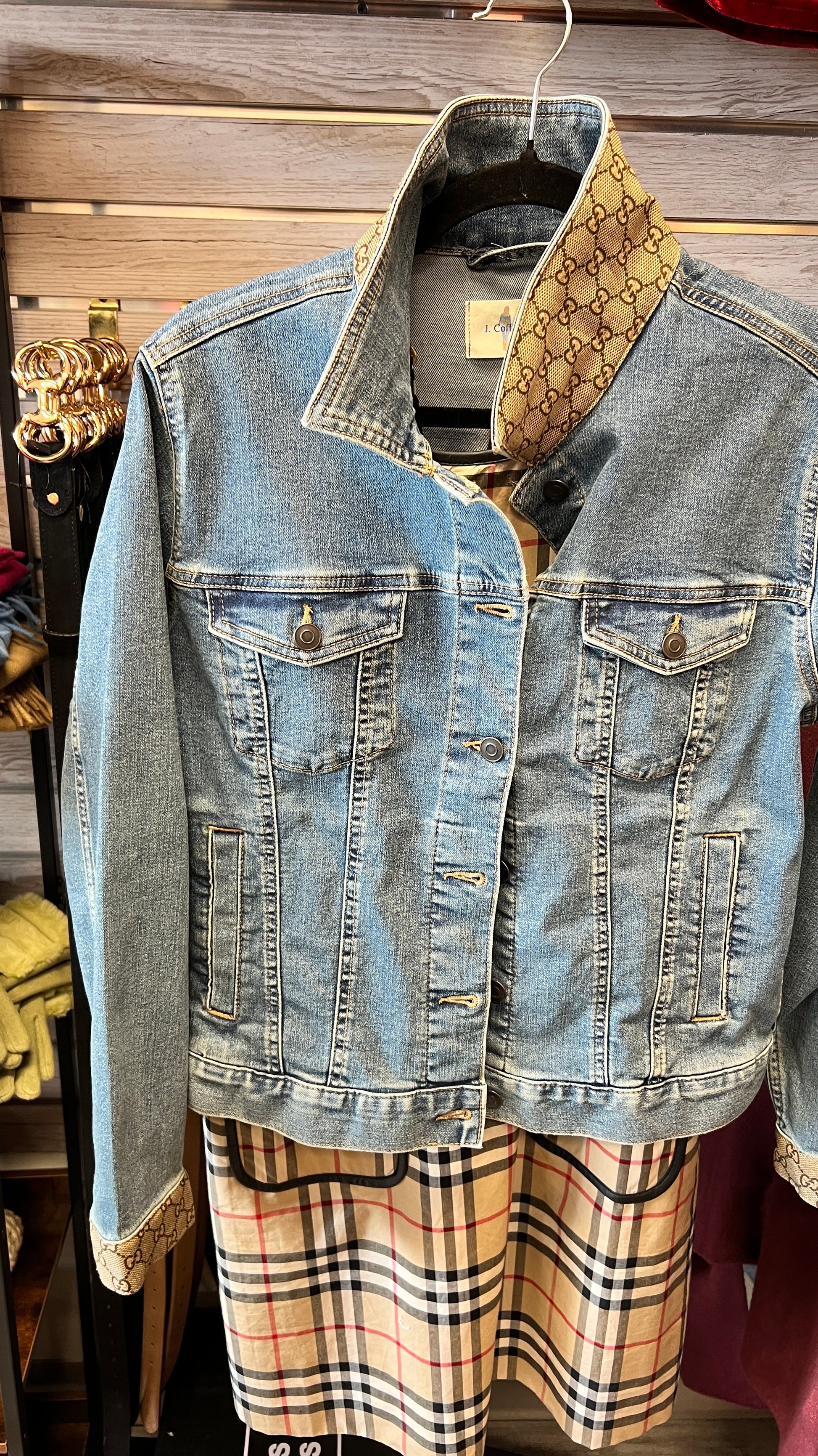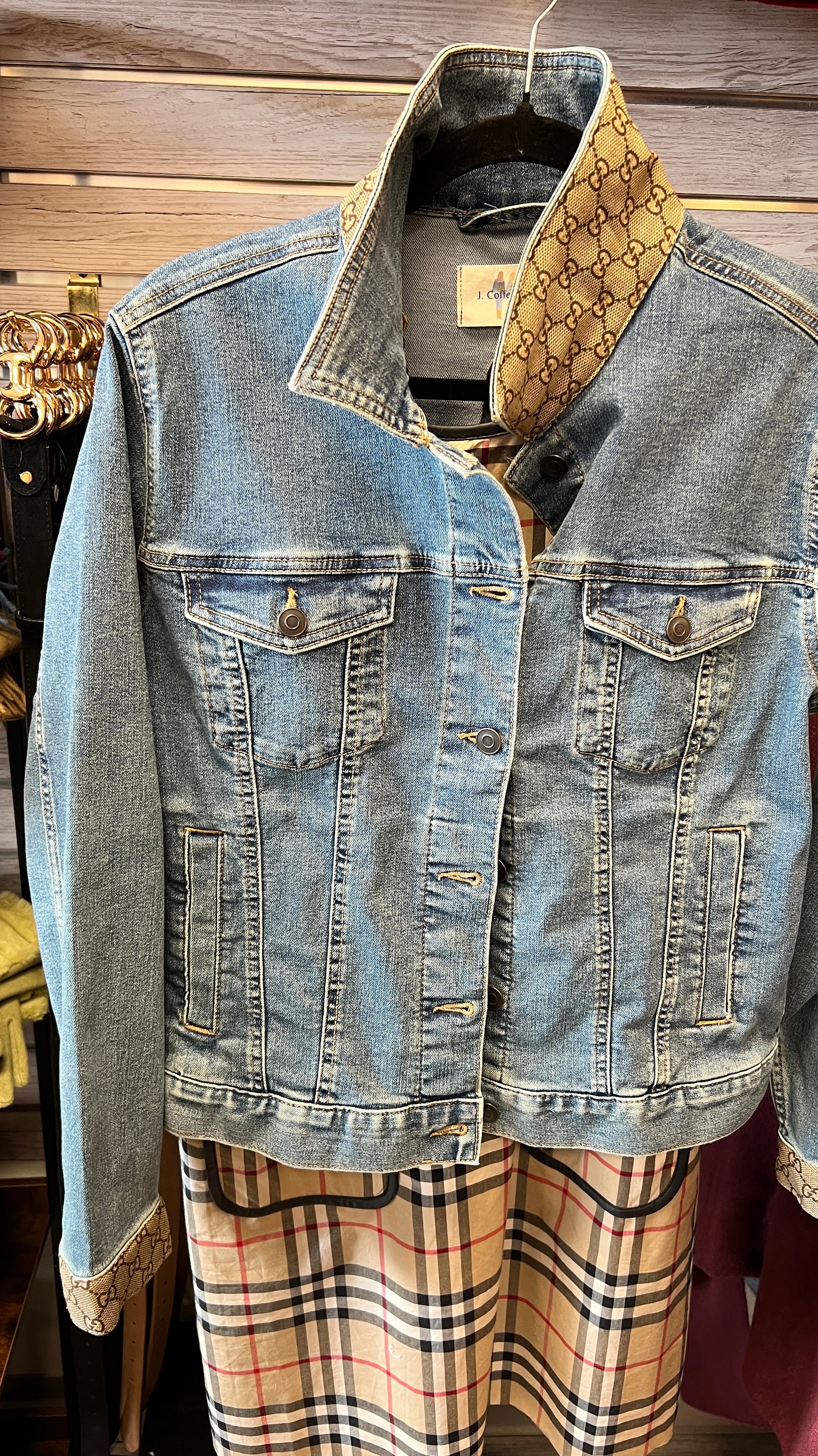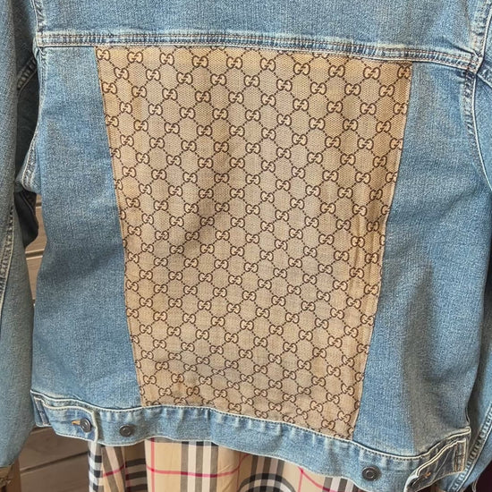 Disclaimer: This jacket is not made by Gucci and is not affiliated with Gucci in any way. It is a denim jacket embellished with a designer scarf.