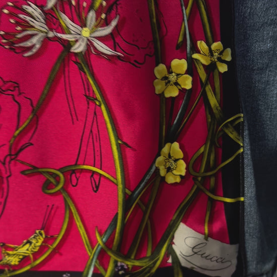 GG Designer Scarf Vibrant Botanical Pink on Blue Denim Jacket Size Medium