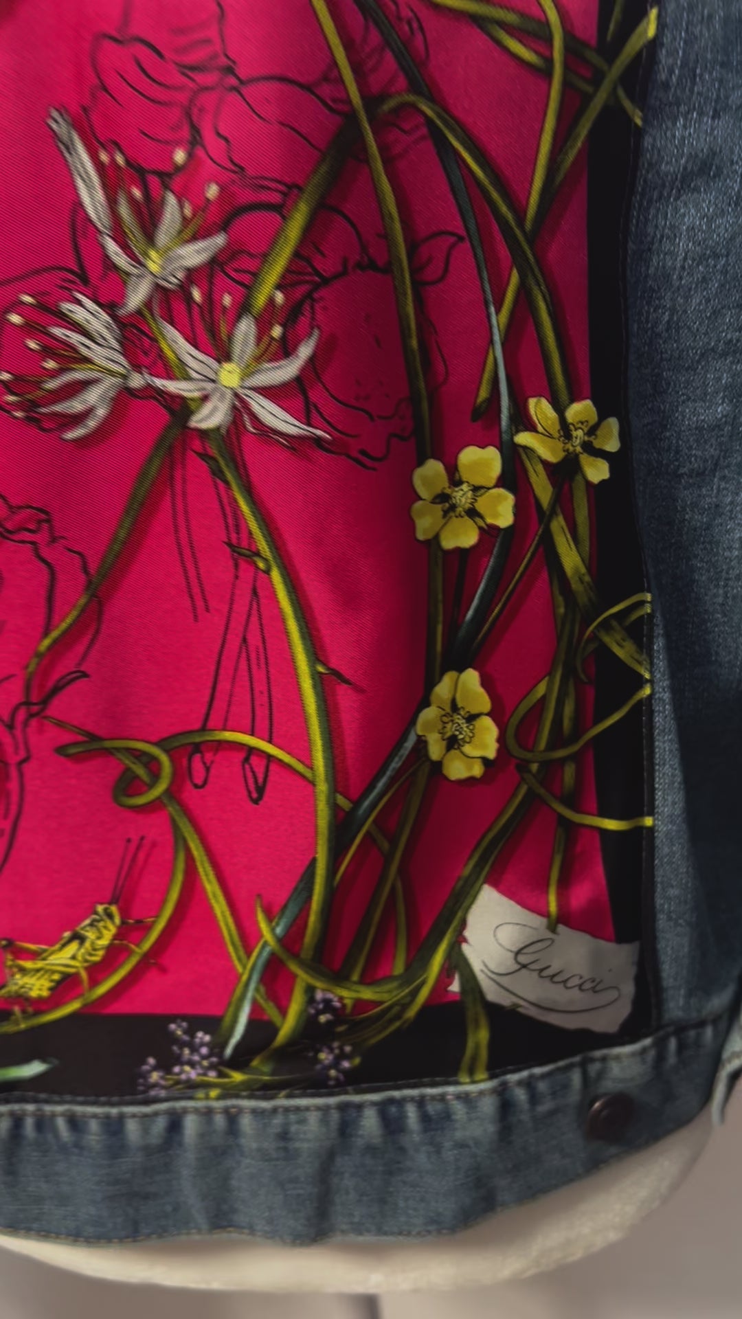 The GG Botanical Pink is a luxurious denim jacket full of vintage charm and sophistication. An array of delicate botanical motifs grace the back and collar, with the classic cuffs also featuring this exquisite floral pattern. Revered fashion house Gucci lends its exquisite styling and craftsmanship to this timeless scarf that pairs beautifully with a classic denim jacket. Made to order. **Disclaimer: This jacket is NOT made by Gucci. No two jackets are the same due to made from different areas of the scarf. Allow 2-3 weeks for delivery. ***the photo is a mock up so that is can be made to order. The back cuff and the back of the collar will be covered with the scarf.