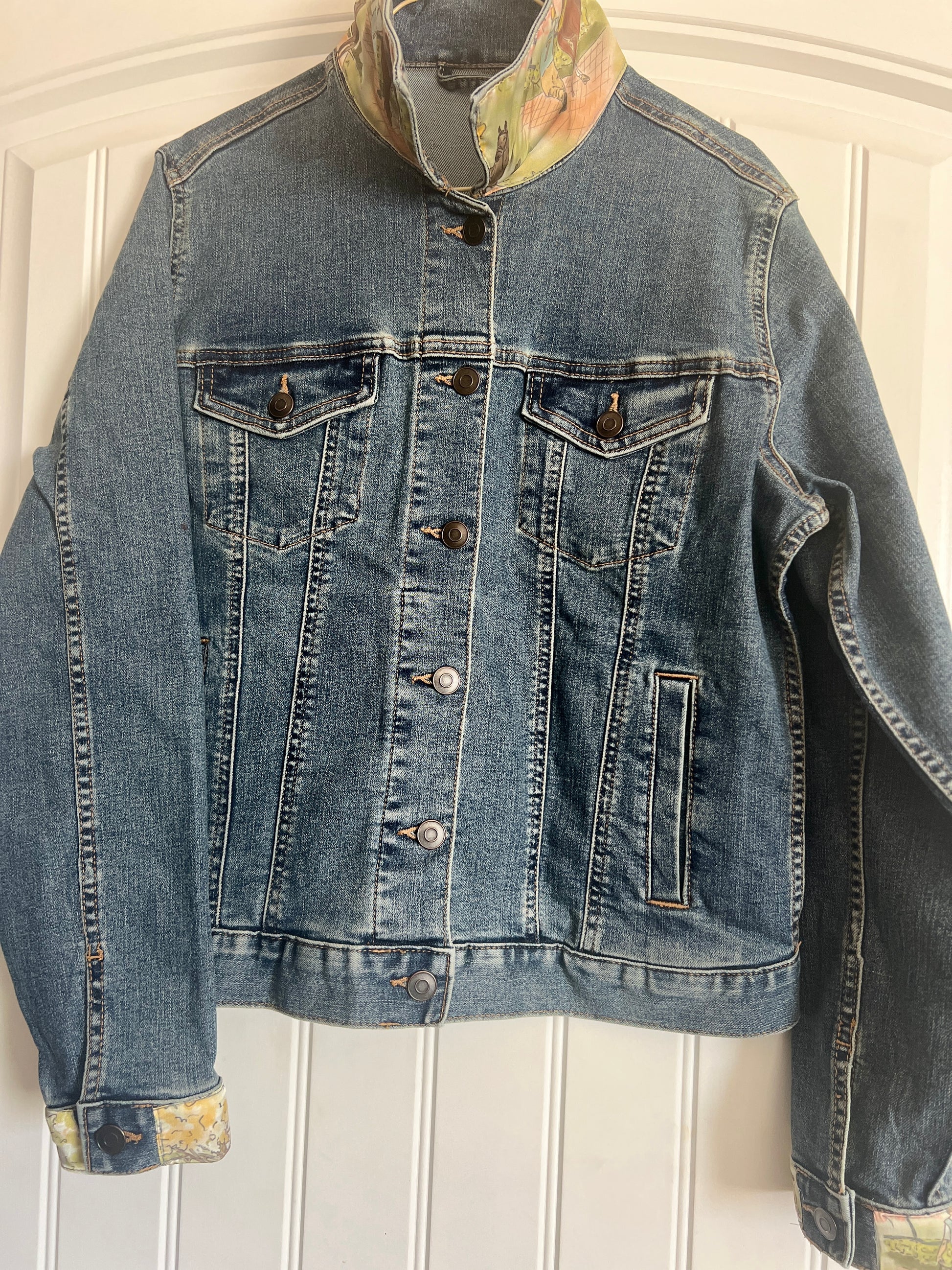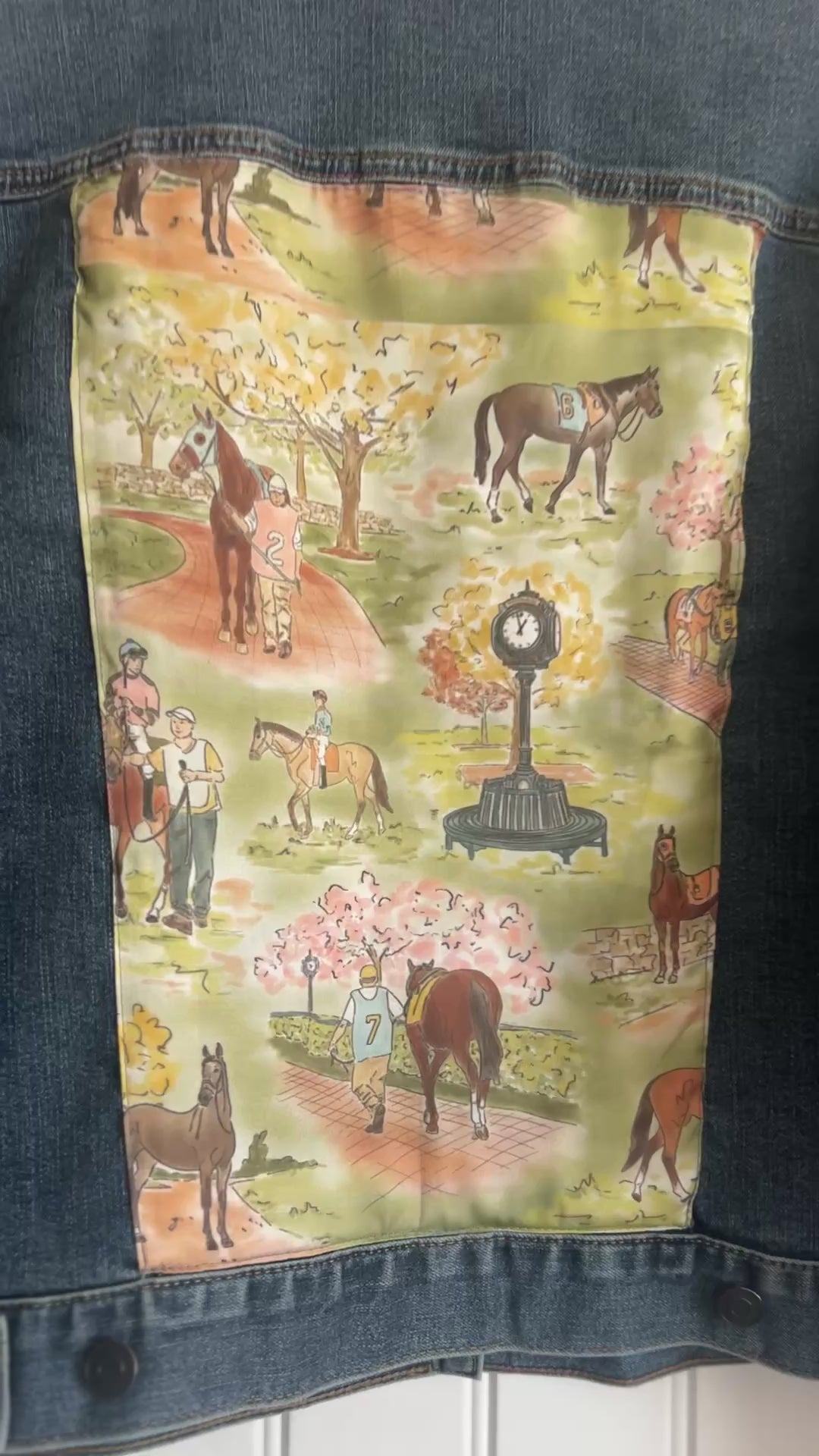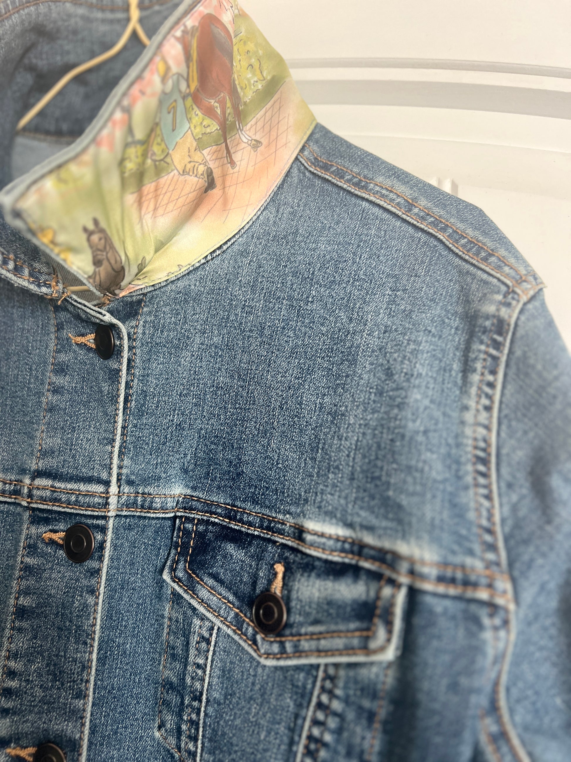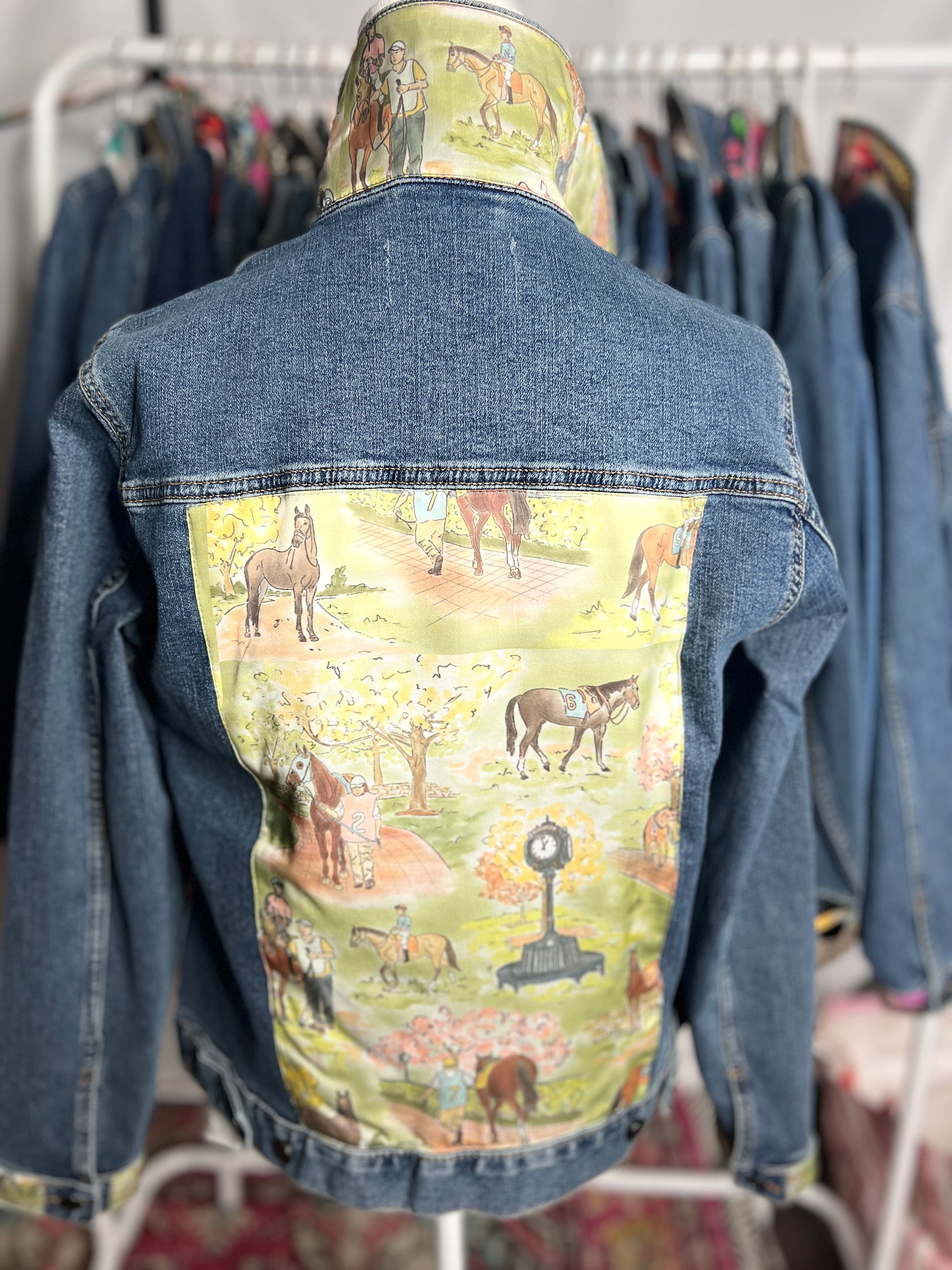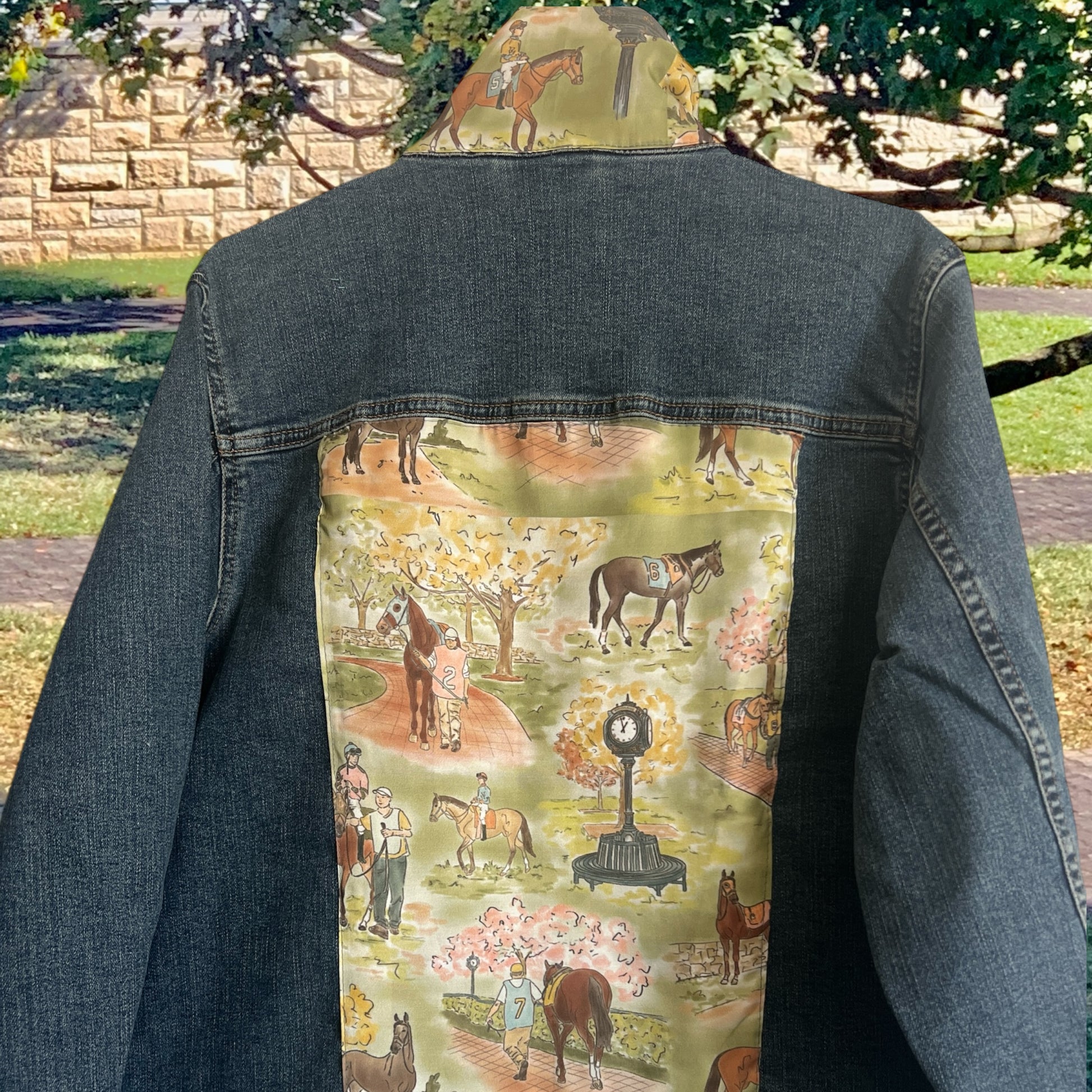 Wrap yourself in the spirit of Keeneland. The Paddock Jacket features classic denim elevated with luxurious silk detailing — the cuffs, collar, and back are adorned with an exclusive Keeneland paddock scene: the renowned Click tower, horses being led to the track, and the iconic stone fences of the Bluegrass. A timeless statement for race days and beyond, each jacket is thoughtfully crafted to celebrate tradition and effortless Southern style. Allow 2-3weeks delivery.