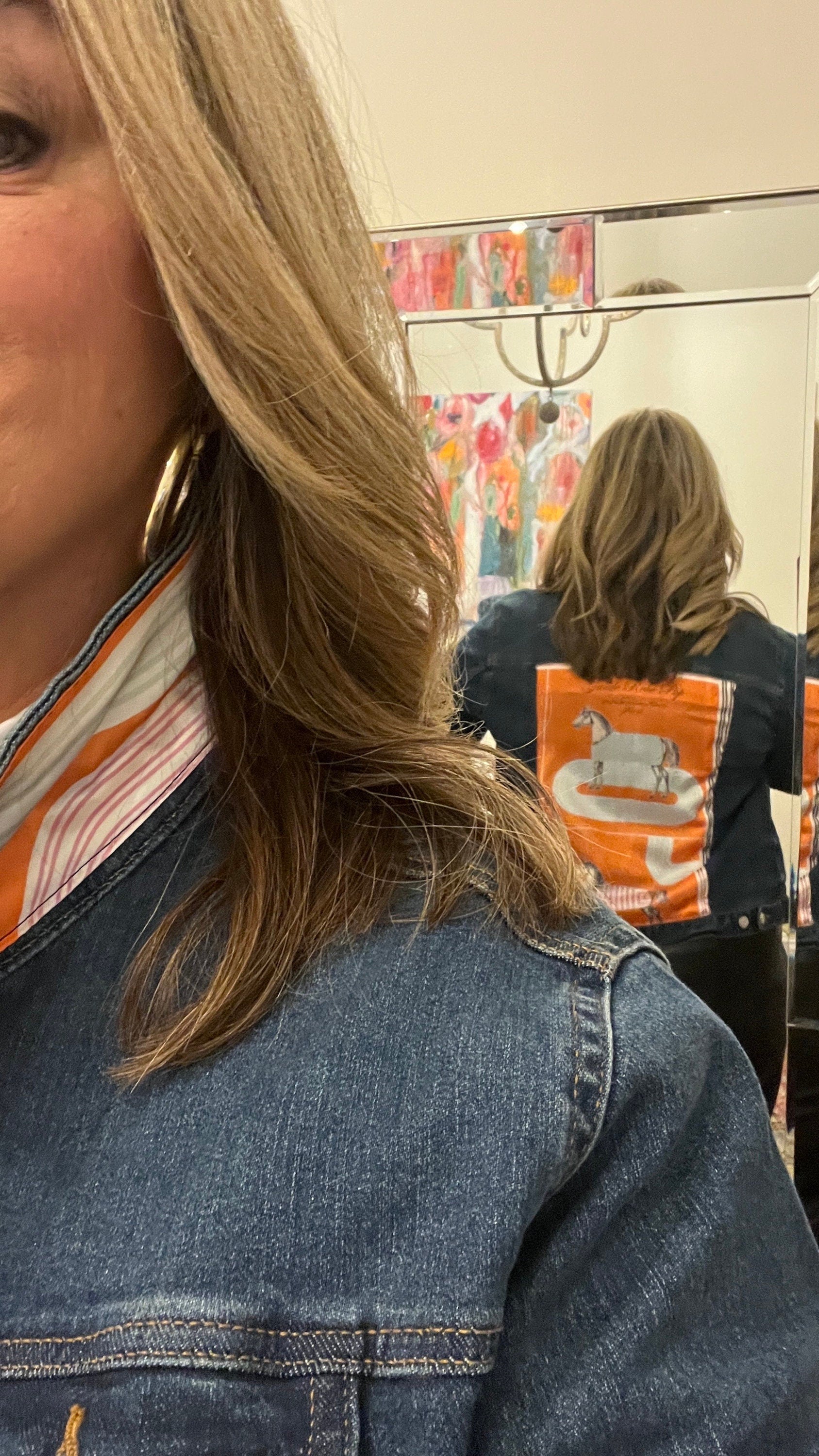 Orange and Pink Horse Track French Scarf A classic custom denim jacket embellished with a classic silk scarf on back, collar and cuffs