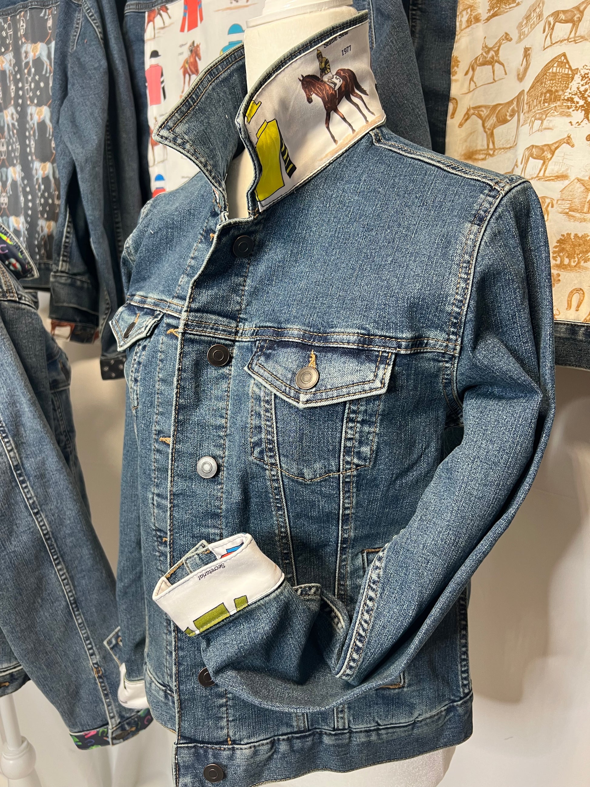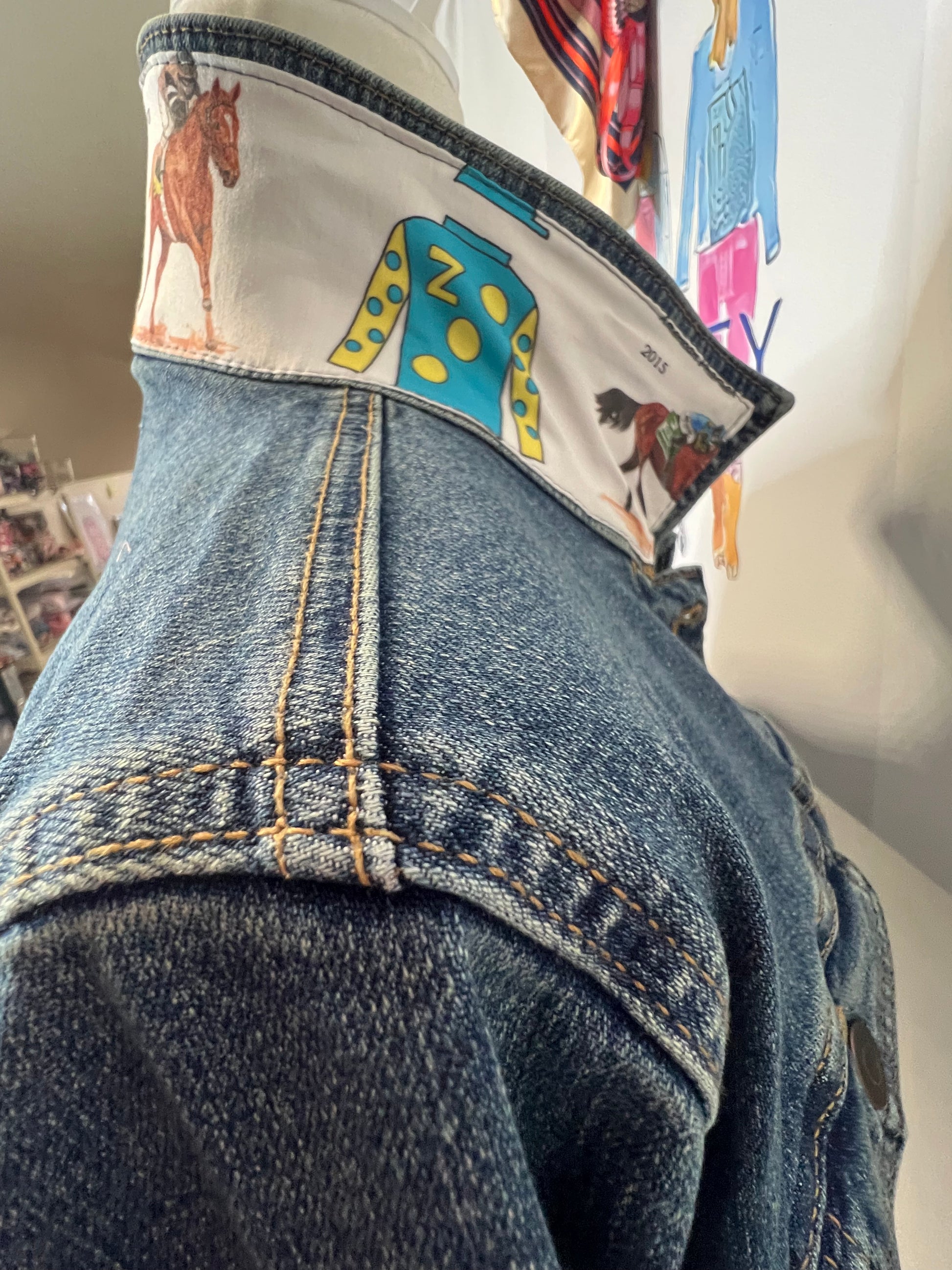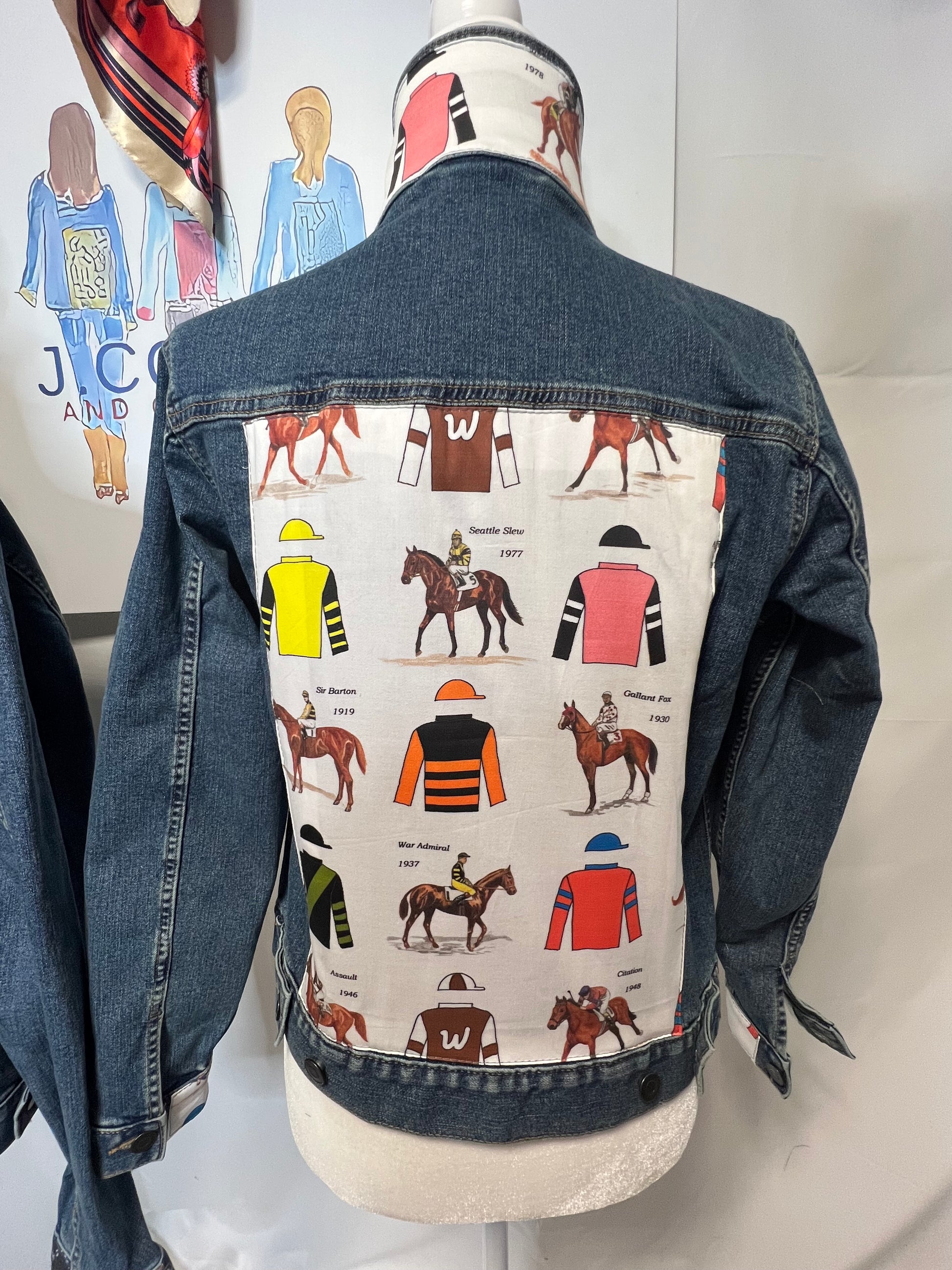 A jacket fit for champions! This one-of-a-kind denim jacket features a stunning tribute to every Triple Crown winner, blending timeless equestrian history with wearable art. A must-have for horse racing enthusiasts and fashion lovers alike! A classic denim jacket embellished with a beautiful silk cotton blend of fabric. Allow 2-3 weeks for delivery.